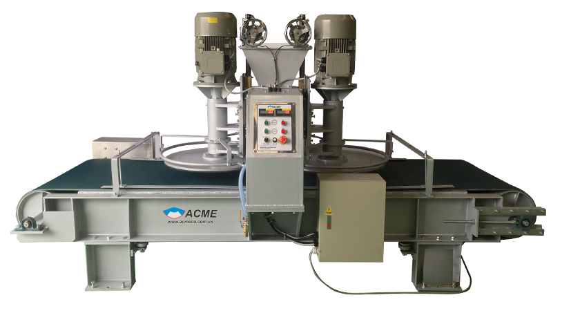 Máy mài 2 đầu dùng để mài phẳng bề mặt tấm đá, phù hợp với các loại đá: granite, marble,.